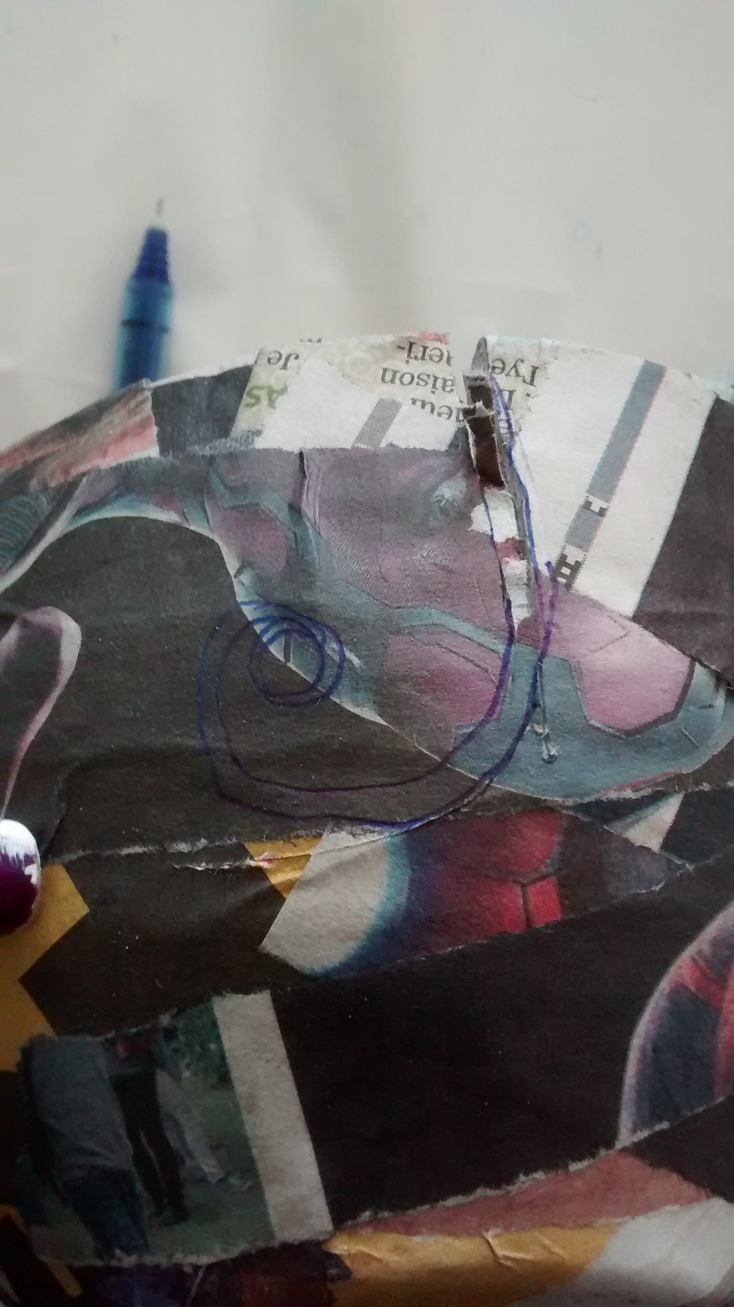 Lorsque c’est bien sec, c’est le moment de découper la « craque » pour la laine. C’est plus facile avec un exacto. Renforcez ensuite les bords de la découpe de la même façon que les bords du bol, avec des lanières très minces si nécessaire.