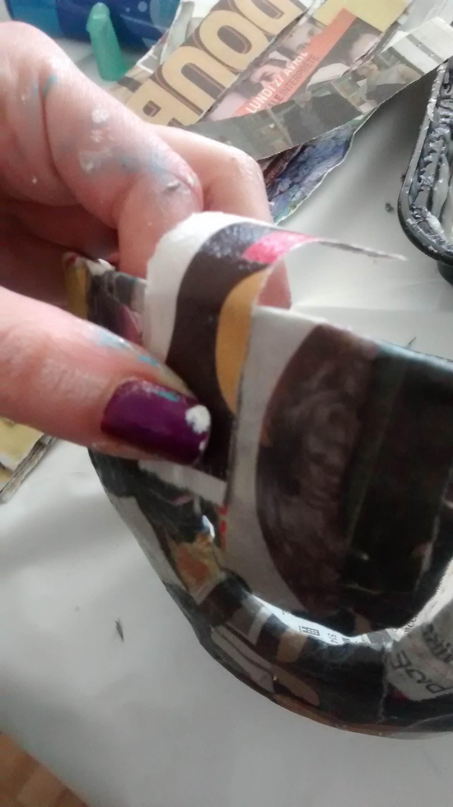 Ensuite, trempez une lanière de papier dans la colle, enlevez l’excédent et posez-la sur votre moule. Étampez-la bien comme il faut en enlevant le plus possible les plis.